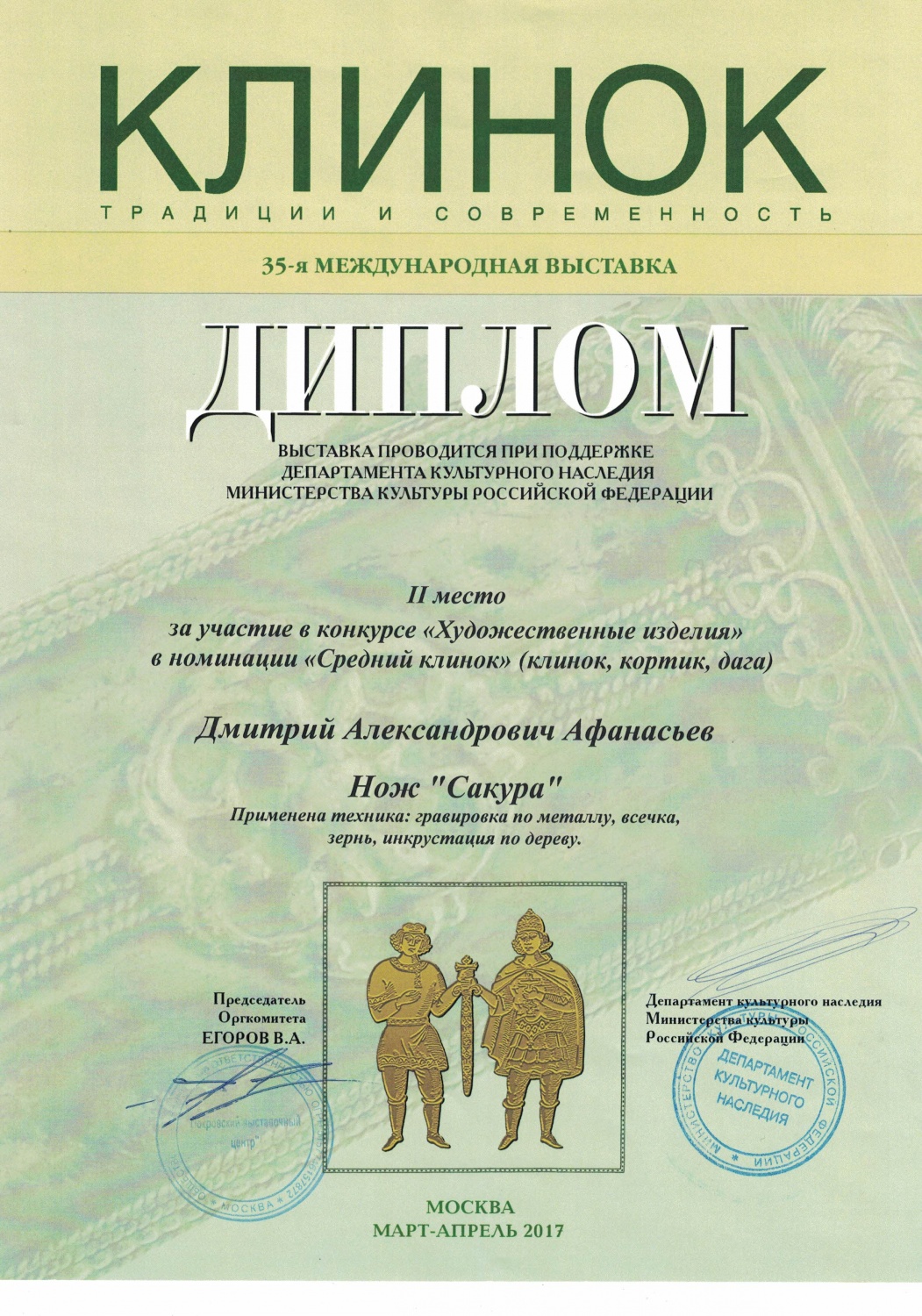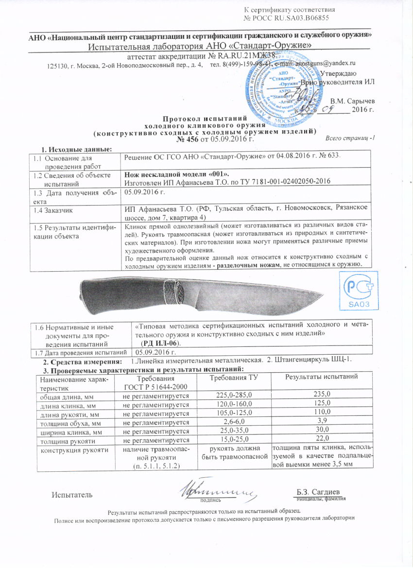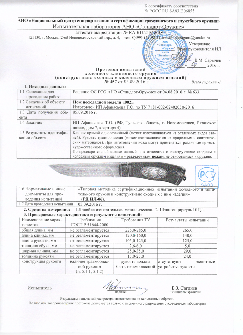 Протокол испытаний холодного клинкового оружия №456